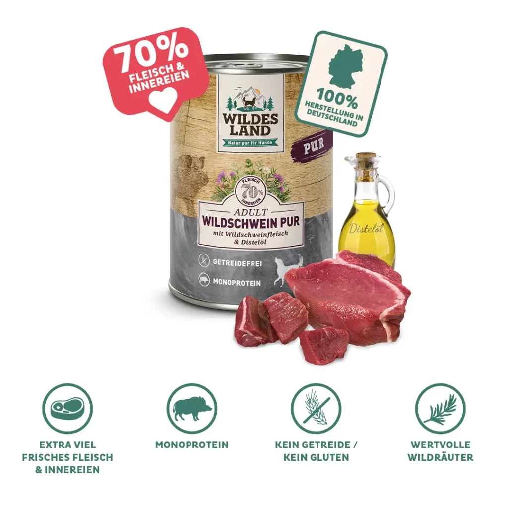 Les aliments humides Wildes Land Pure apportent à votre chien tous les nutriments essentiels et, grâce à leur formule monoprotéine à base d’une seule source de viande, conviennent également aux chiens à digestion sensible